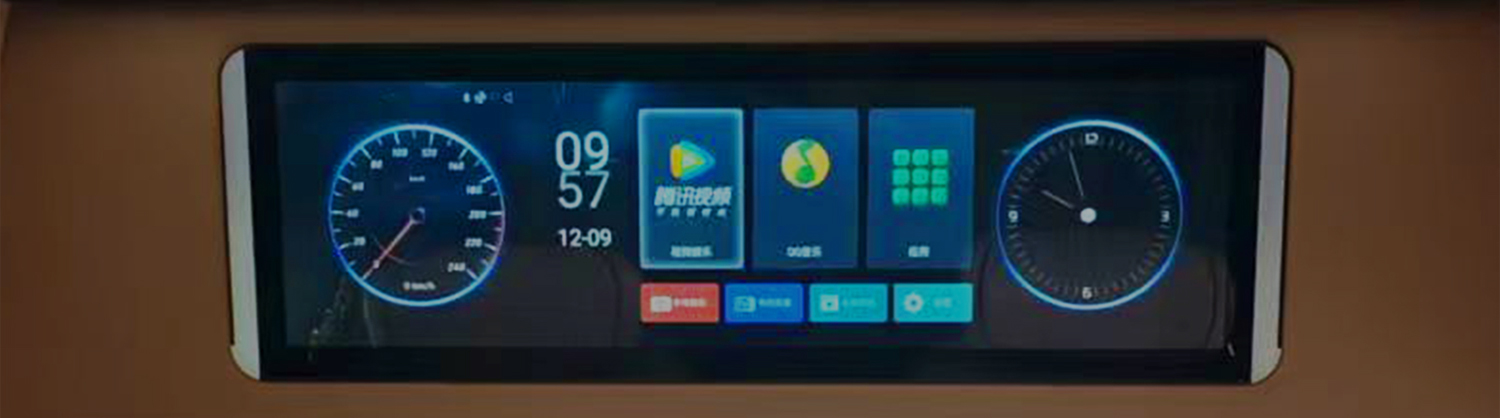 Ultra-wide panoramic displays in 22.5" to 29" sizes for luxury vehicle rear cabins. These stretched bar screens span rooflines or seatbacks—delivering centralized entertainment control, climate interfaces, and media streaming on one seamless panel.