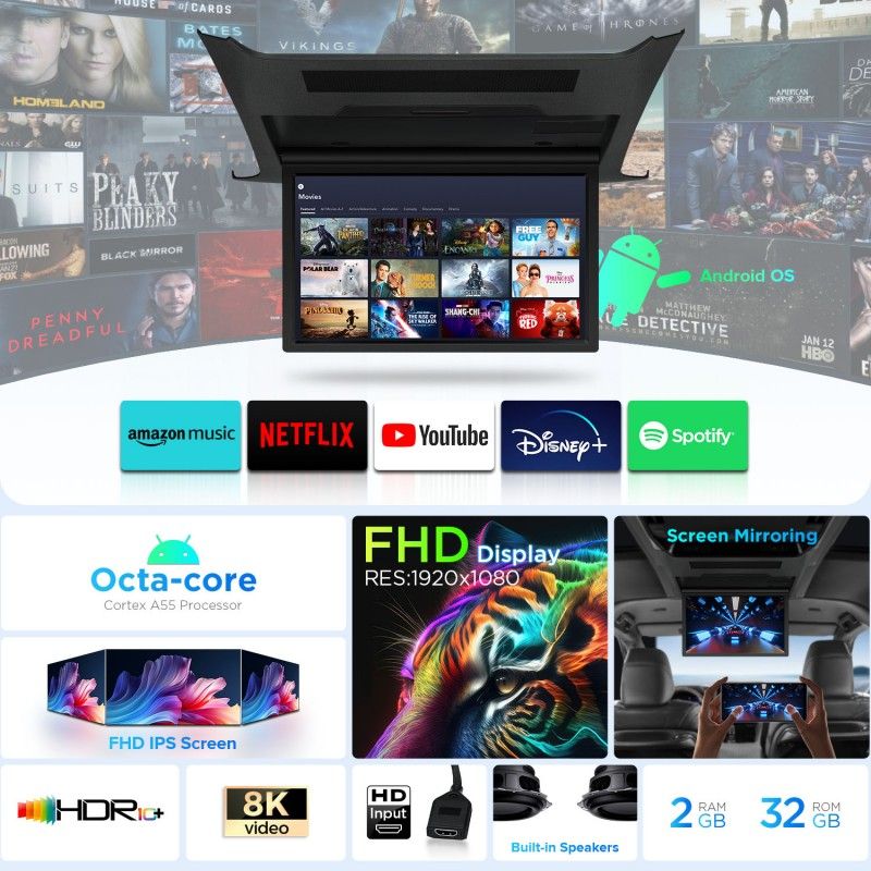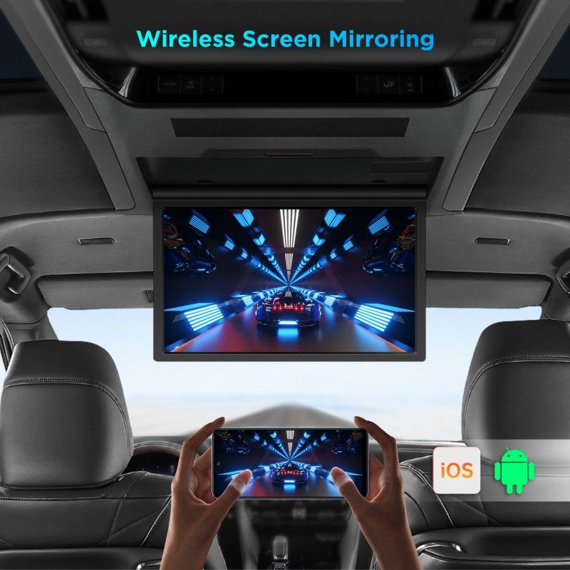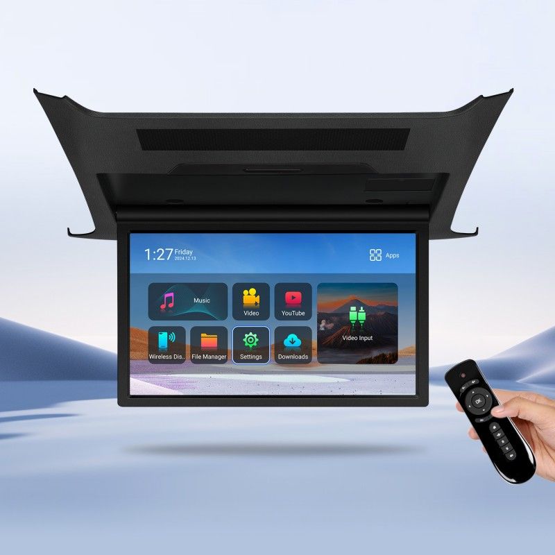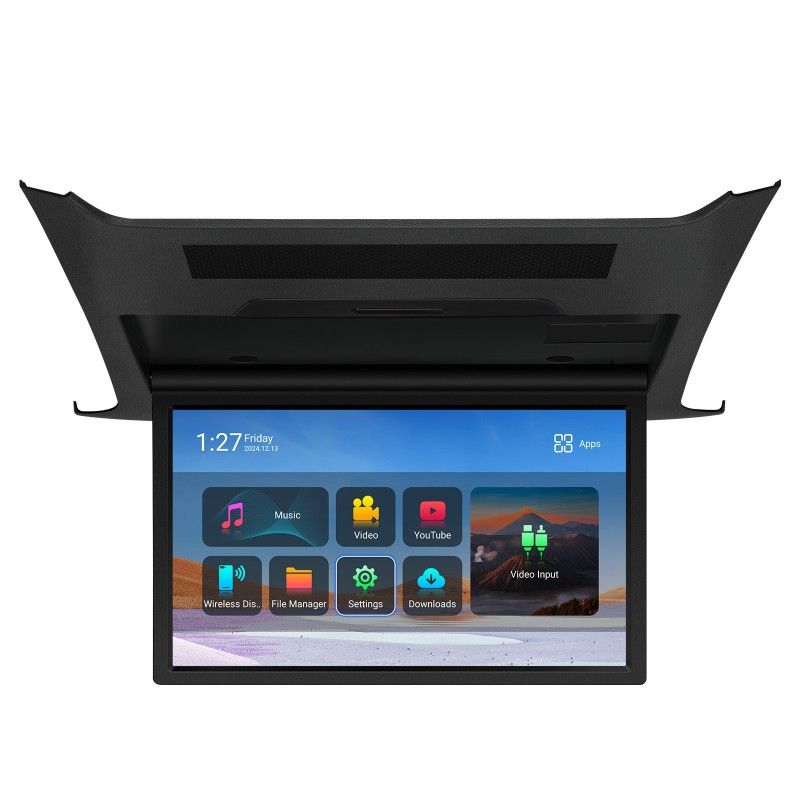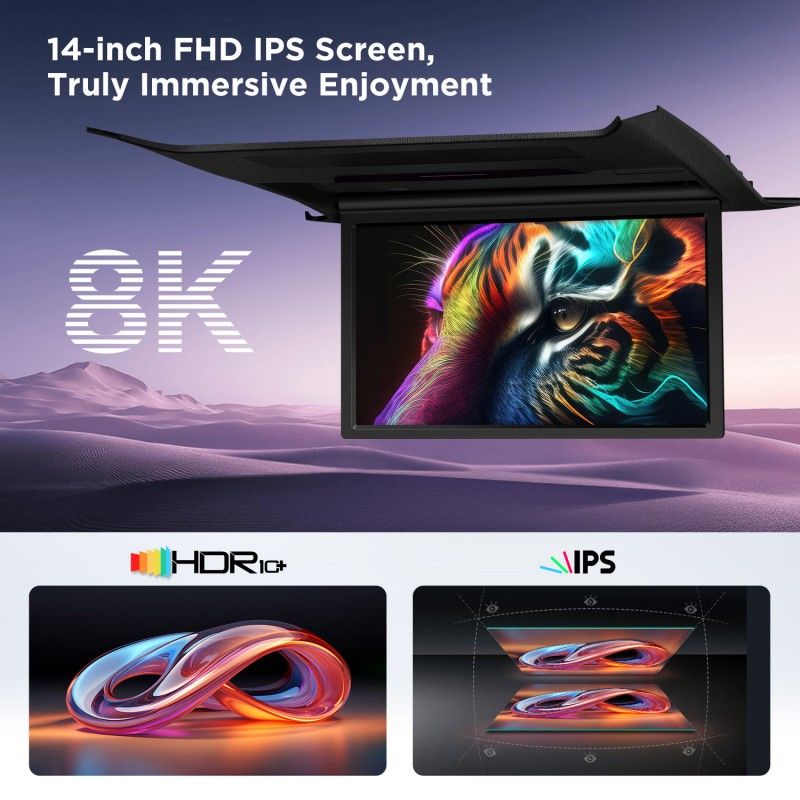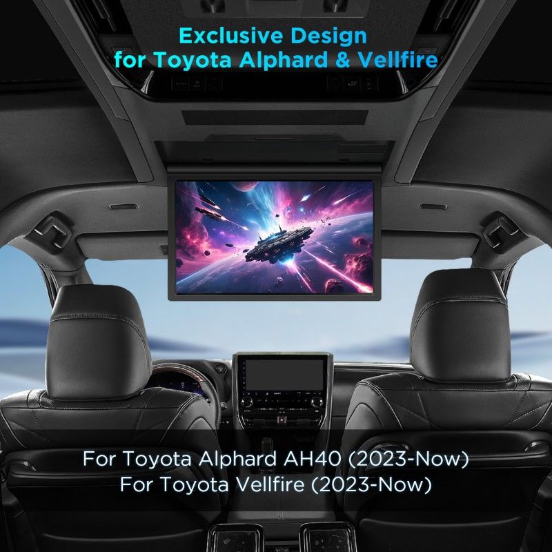 OEM-molded ceiling unit for Sienna, Highlander, Land Cruiser—zero-gap finish, 30-min plug-and-play harness. 14" 1080/2K IPS flip-down, Miracast + HDMI + USB, 0-25° tilt, keeps factory headroom.